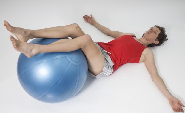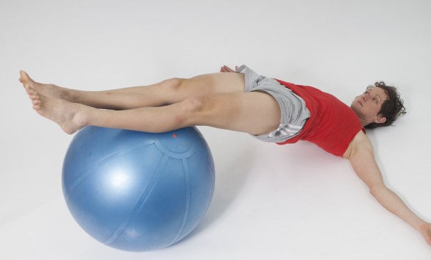Lay with your legs on the ball (see top picture) and your arms outstretched at your sides. To start with keep the ball close. Push down with your legs and lift your hips and chest as high as you can, drawing your tummy in as you go and squeezing your bum at the top. Hold the top position (aiming for your shoulder, hip, knee and ankle to be in one straight line) for 5-10 seconds before returning your hips to the floor with control. Repeat 10-12 times for 2 to 3 sets with a 30 sec rest in between. To progress the exercise start with the ball a little further away from you (ensuring that your hips don’t drop), or cross your arms over your chest for added instability/difficulty.