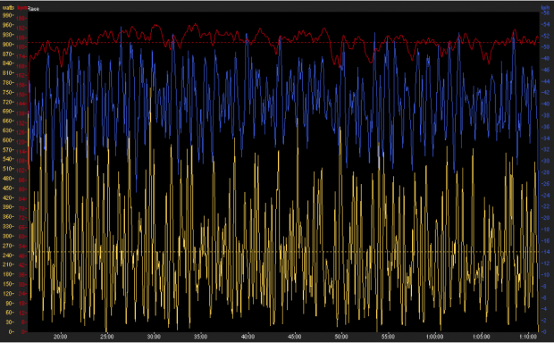 A well-trodden path into racing, whether as a complete newbie or coming from a sportive background, is to try time trialling, then maybe a local race on a closed circuit and finally, once bunch skills and speed have been developed, to try a sanctioned road race on the public highway. As you will see from the graphs below showing the power output and heart rate response to these types of effort, the different disciplines each have unique characteristics, sometimes very different to each other.