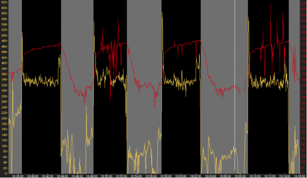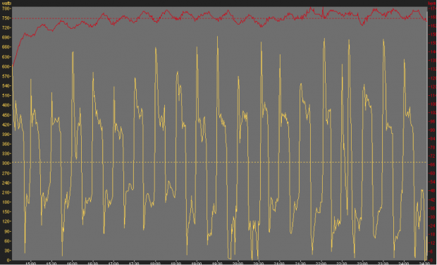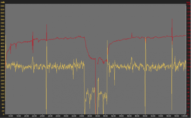 The graph below shows ten minutes of work where average power output and heart rate (dotted lines) are the same as a time trial effort, but the rider has alternated 15 seconds of work well over time trial pace, but not quite a full on sprint, with 15 seconds at endurance pace.