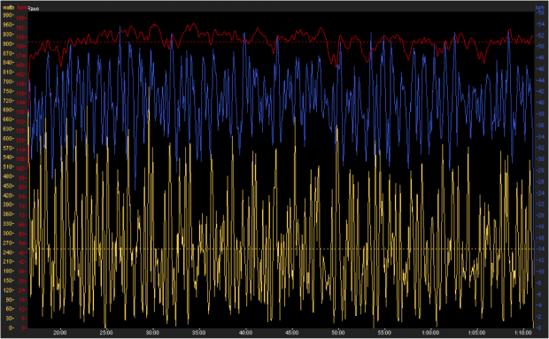 As you will have noticed, one big difference from sportives is the length. Generally lasting under an hour, circuit race are closer in duration to time trials than the endurance events you might have completed in the past. As we hinted in the first instalment of this series, the other big difference is the pattern of racing, with the highly variable intensity as shown in the figure below.