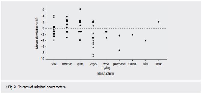 This setup allowed the researchers to compare the average power as recorded on the various power meters to the true value. Each power meter was tested a number of times with a number of different riders.