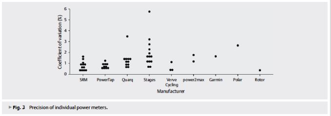 Now just as with the average accuracy, the average precision doesn’t tell the entire story. We can also look at the precision of the individual power meters across multiple tests (figure three).