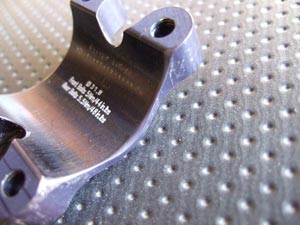 Giving it a chamfer requires nothing more than a willingness to take a craft knife to the mating surface. It is lightly drawn around the edge of the clamping surface to give a slight radius to the corner; no need to take off more than the faintest shaving. Use a round or half-round file if preferred, but the knife does the job perfectly well and is less likely to be too fierce. We also removed some of the anodising from the mating surface using fine grade wet-or-dry paper, since the surface is hard and not especially grippy and the bars shown had previously slipped, and made sure we removed all traces of abrasive afterwards.