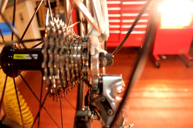 Shift through the gears, checking that when running “big and big” (the outer chainring and the largest sprocket) the chain is sufficiently long. Start with the chain on the big chainring and the smallest sprocket and carefully change up the cassette to the largest sprocket.