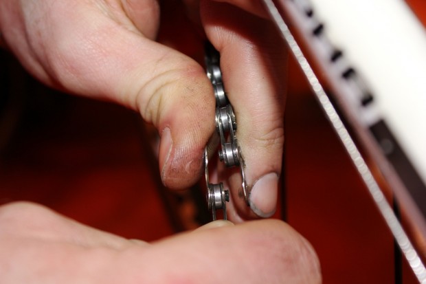Having assessed the overlap, reduce it by removing links with the chain splitter tool. Do not push the pin all the way out of the link. While we’re using a Powerlink here, it’s possible to rejoin the chain with a pin.
