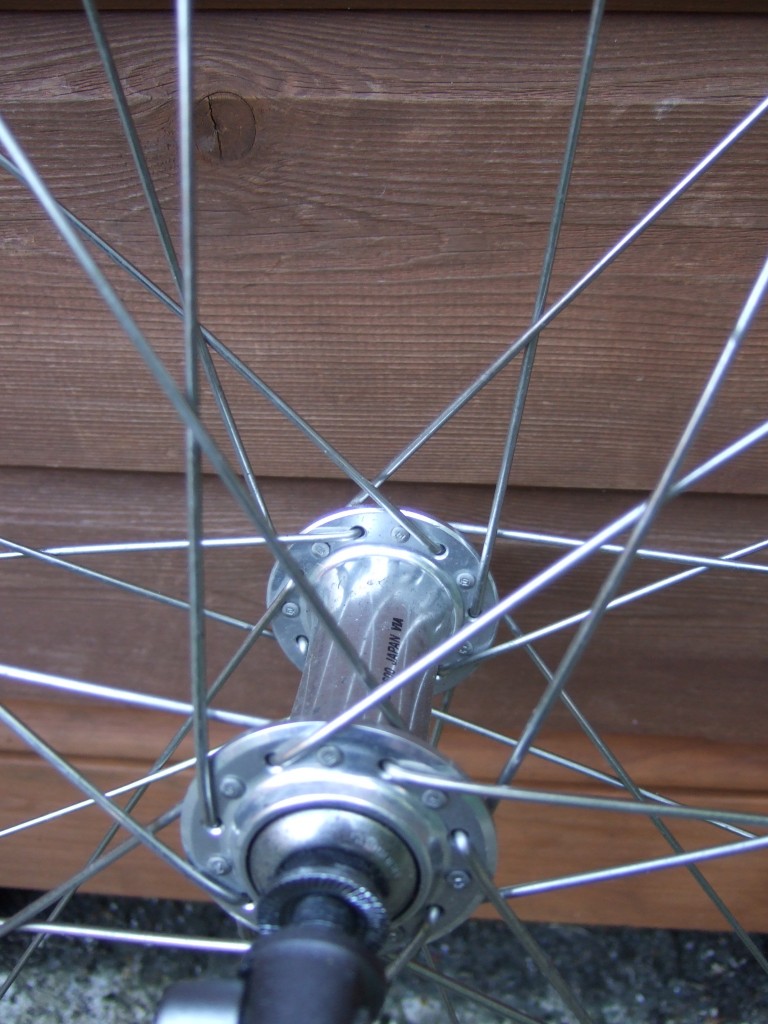 The eagle-eyed will notice that the rear wheel of my Roberts 3-Speed is laced two-cross in the picture. This is because the correct spoke length for three-cross was not available at the time of the build. The wheel as shown proved unsatisfactory, breaking a spoke after some 2,000 miles, and has since been rebuilt with spokes crossing three. This was probably due to flex caused by the hub moving relative to the rim under power as a result of the less-than-tangential angle of the spokes with the hub flange.