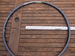 Insert your two gauges into eyelets on exactly opposite sides of the rim. Count eyelets to make sure you are not offset by one; 16 for a 32hole rim etc… Now simply measure the distance between the ends of the spokes, add 400mm (the lengths of the two spokes) and you have your rim diameter. In this case (Mavic’s Open Pro) we have 204mm + 400mm = 604mm. Voila!