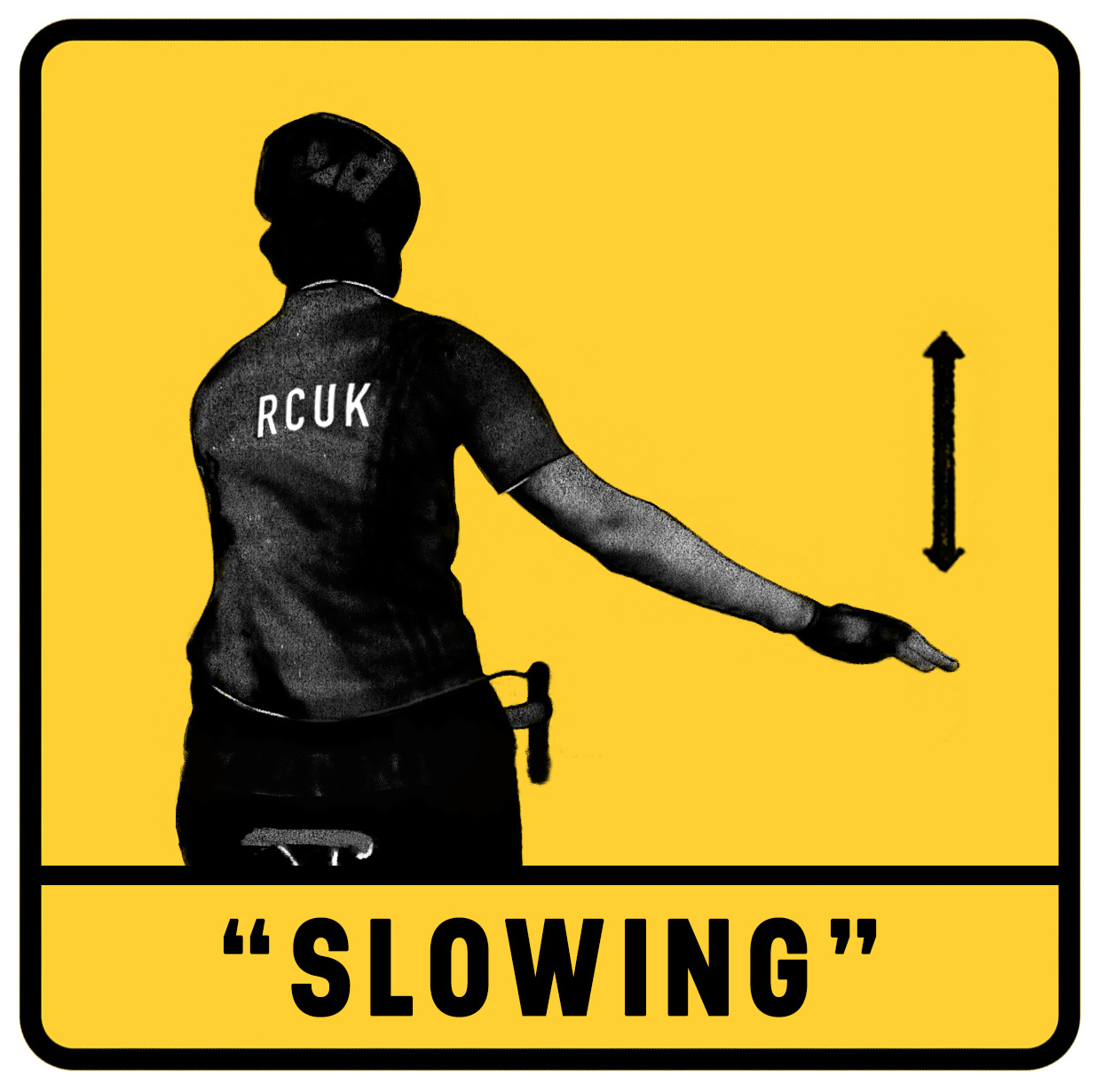With your arm outstretched, palm-down, and slightly behind you so cyclists behind you get a clear view of your hand, move your hand up and down at the wrist to indicate that you’re about to slow. Use this indication when you’re confident that you’re going to be pulling the brakes in order to significantly slow your speed.