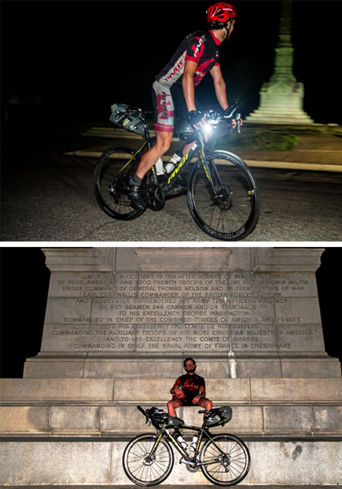 While Hall would later rue following such a brutal early schedule, his prognosis that he could draw on his own experience to exceed Lane’s rate of progress would prove accurate. It was Hall who arrived first at the finish in Yorktown, Virginia after 17 days, 16 hours, and 29 minutes, and by some margin over Lane: enough to allow himself the luxury of a night’s rest on the porch of an upmarket hotel at the Blue Ridge Parkway, and to ride enjoy the Parkway’s spectacular scenery at dawn – a decision he’d make again “in a heartbeat”.