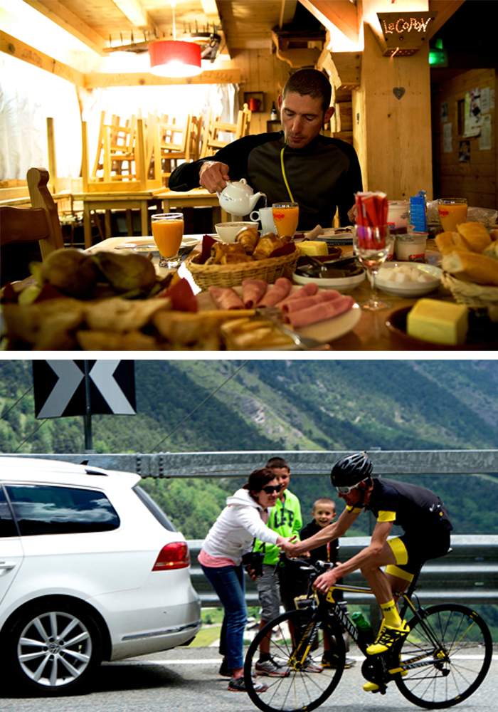 Despite his stature, Roux’s physique is one able to serve as a dictionary definition of lean (‘adj. having no superfluous fat, see Roux, Nicolas’) and members of our party unfamiliar with the breed are shocked by the elite cyclist’s disdain for body mass. There is an unmissable symmetry between the contours of his legs and the mountains that have shaped them. Roux is no mere tour guide, however. He remains a competitor.