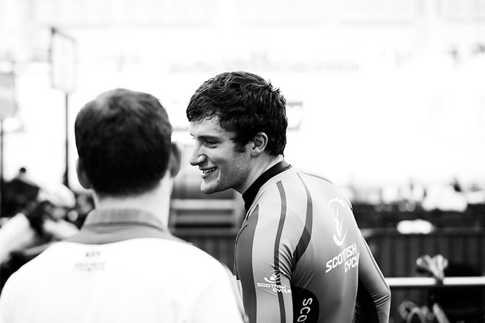Leeder stands at the gate that serves as the riders’ entrance to the track from the so-called ‘mixed zone’ in the centre, and chats with sprinter, Helen Scott, tandem pilot to Aileen McGlynn, and winner with McGlynn of Paralympic silver and bronze medals at the London Games, one of the few senior riders present in Glasgow. He is here to provide support to a young squad that includes Academy members, Danielle Khan and Rosie Blount, who come and go amid practice laps while Leeder and Scott talk.