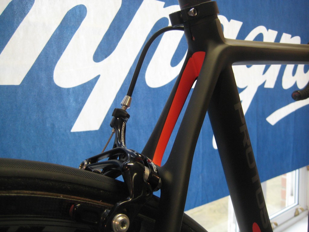 Frame weight is 800g, shaving 150g off the frame used on a De Rosa bike unveiled in 2006 and bearing the same name. The matt black and red highlights make for a stunning finish, with De Rosa’s trademark heart slapped on the downtube. Talking of the downtube, the cross section with the bottom bracket is one of the fattest we’ve seen. That’ll be stiff – and fast. Particularly interesting is the flat fronted fork, which somewhat balks in the face of the aero trend that is sweeping the industry.