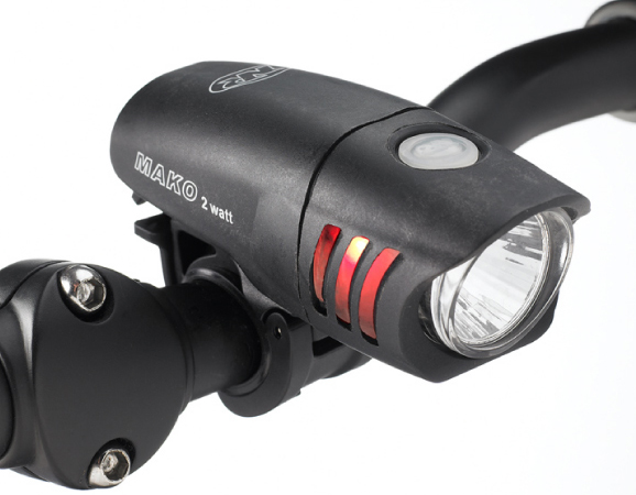 Niterider’s Mako 2 Watt front light is new for 2012 and we particularly like the inclusion of ‘gills’ on either side of the light unit which emit a red light, thus improving your side-on visibility. Perfect for commuting.