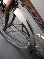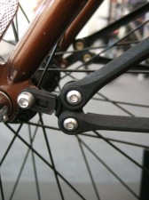 At the mudguard end, the stays are secured to plastic bridges using stainless steel panhead screws threaded into brass inserts. The same construction is used at the hub end, where a three-bolt arrangement allows maximum adjustment as well as the possibility of attachment either to a threaded boss or to a bracket zip-tied to the stay or fork blade.