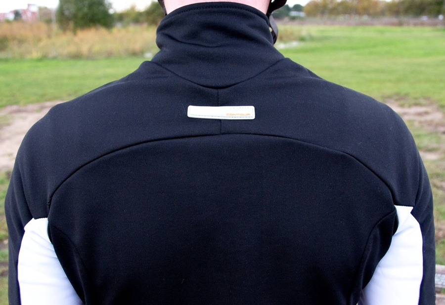 The Contour jersey is fleece-lined, has long sleeves, a full zip, and three rear pockets; the last finished on either side with a short reflective strip. The collar is deep (three inches), slopes from back to front, and covers the throat entirely when bent over the bars. The hem is elasticated at the front and has a deep band at the rear lined with silicone dots, a feature of the collection. The cuffs simply fold over. Early indications are good: the fit is close and the fabric stretches well. Our only reservation at this stage are the white panels that are the undersides to the arms, which are likely to lose their brilliance fairly rapidly on winter roads in Britain.