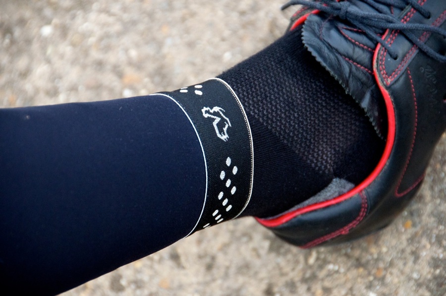 The star of the show before turning a pedal, the De Marchi leg warmer fits beautifully and looks great. The fit is excellent throughout: an unbroken band of silicone at the top grips firmly without constriction, and the deep cuff at the ankle repeats the trick in stylish fashion. The long, circular knee panel doesn’t feel restrictive off the bike, so we have high hopes for its performance on it. Its fleece lining is soft.