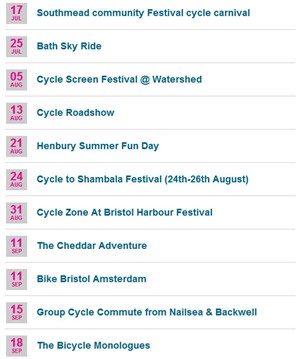 - Cycling in the City at Colston Hall: a day long showcase of all things bike, with live pedal powered stage, bike fashion show, stunts, talks and films.