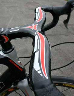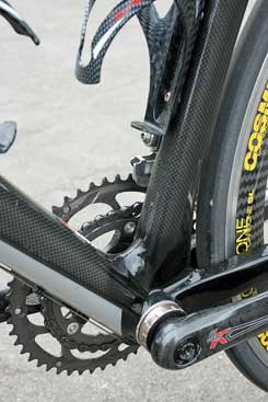 Beginning at the front, the forks are teardrop shaped with a long trailing edge, and slot into a slim hourglass shaped head tube. Both the top and down tubes are profiled to encourage fast air flow across their surfaces, and the seat tube follows a path around the rear wheel. The bottom bracket is, not unusually, reinforced with plenty of carbon plus a small bridging section between the seat and down tubes.
