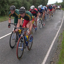 By now, team tactics were beginning to show and the road race started with the 8-man strong Prestige VC team controlling the pace of the bunch so as to enable their man, Duncan Urqhart, to consolidate his position as the ‘green jersey’ points leader. They helped him to take maximum points at each of the ‘hot spot sprints’ on the motor circuit before the race went out onto the public roads.
