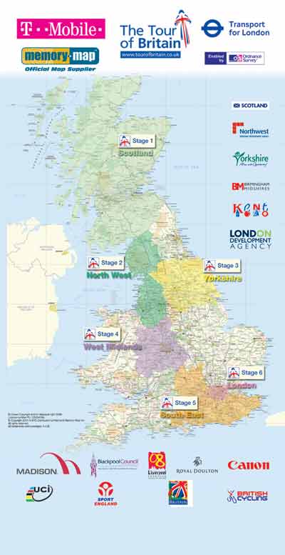 This year will see an additional sixth stage. On this stage the race will follow a proposed 2012 Olympic cycling route up and over Hampstead Heath then down to Regent’s Park, through Hyde Park on to the Tour de France Prologue route and finally in to St James’s Park for 20 laps of the park’s perimeter to the finish. Here’s a map with the locations of all the stages: