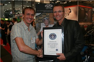 Round-the-world cyclist Vin Cox has been officially presented with his Guinness world record by former England star Geoff Thomas.