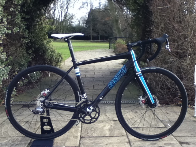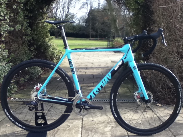 Eastway may well have stolen a march on the competition by producing a disc brake compatible road bike, the RD1. None of the big three component manufacturers has publically committed to a hydraulic disc brake yet, perhaps awaiting a definitive statement from the UCI on their competitive use, but it has the feeling of the inevitable about it, even though many, your correspondent included, baulk at the aesthetics. On trend in all other aspects (Far Eastern carbon frame, tapered head tube, broad bottom bracket shell) the distinguishing feature of (for now at least) cable-operated disc brakes may help it stand out in an increasingly crowded market.