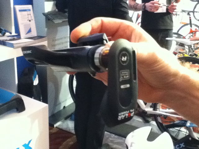 Tacx displayed a new turbo trainer, the Genius Multiplayer, which adds and reduces resistance in synch with the virtual course displayed on a computer display with which it communicates wirelessly. The virtual ‘rider’ on screen responds to pedaling and steering inputs from you, the real rider. Several courses are available, including stages of the Tour De France, or you can upload any favourite local rides from your GPS device. Tacx also have a new range of team replica water bottles from Europcar, Lotto Belisol, Omega Pharma-Quikstep, Rabobank, and Saxobank.