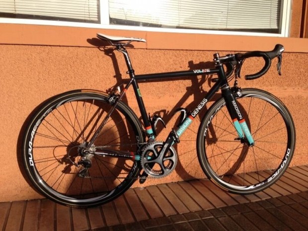 It is finished in the distinctive colours of the Madison-Genesis team, mainly black, with an orange band dividing the main colour from turquoise accents on the lower sections of the downtube, seat tube, and chainstays.