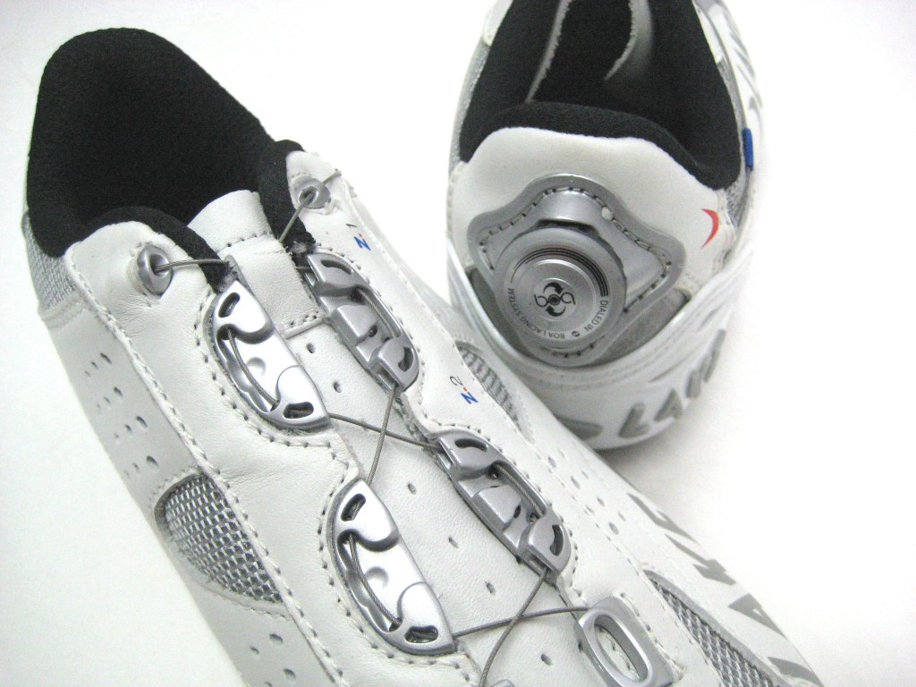 The shoes use a BOA closure system, with cables that snake up the tongue and along the top of the shoe, adjusted at the back by turning the dial clockwise. Pull the dial out, away from the shoe, to release the laces and remove your foot.