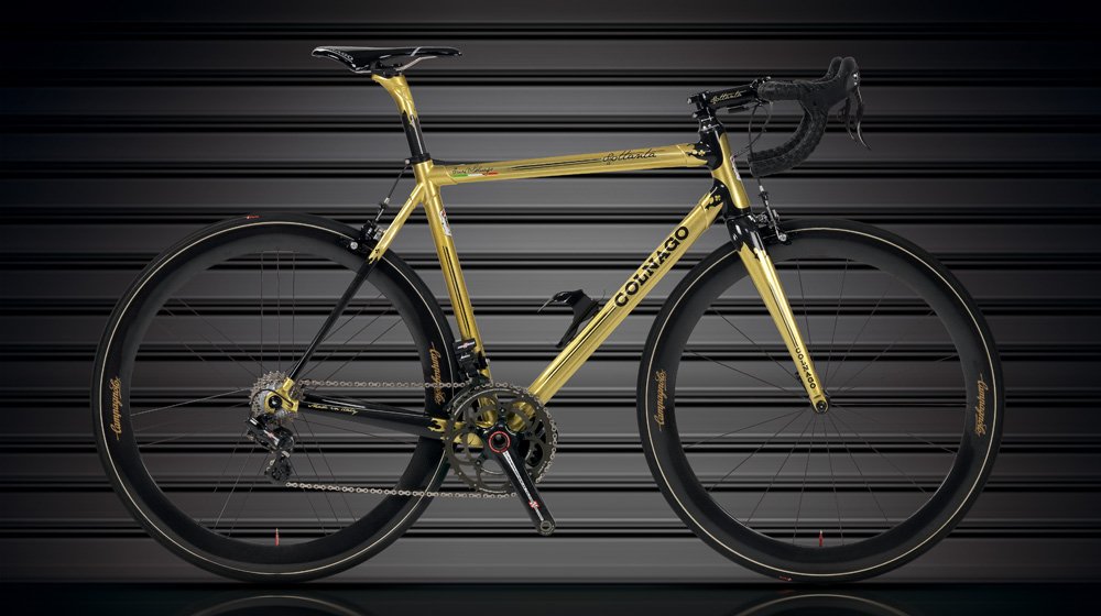 Colnago, renowned for their bold paint jobs, have given the Ottanta a gold finish, with arabesque lugs and Ernesto’s signature on the top tube. The bike is manufactured using the “best possible carbon fibre” and is equipped with Campagnolo’s Super Record EPS electronic groupset.