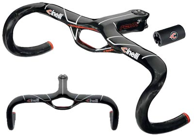 Cinelli will be showing their slightly modified Ram bar – an integrated bar and stem combo made from T700 high modulus carbon that tips the scales at 410 grams. The Ram boasts a ‘thumb zone’ – a recess in which to rest the aforesaid digit, which Cinelli claim provides additional comfort both on ‘active’ phases of the ride (out of the saddle climbs) and ‘relaxed’ periods ( presumably tootling home with thoughts of an afternoon on the sofa). Cables emerge from internal routing at the start of the Ram’s computer mount. The Ram comes in six different combinations of stem length and bar width, starting at 40/100, finishing at 44/130 and covering many points in between. Available in none-more-black clear-coated carbon.