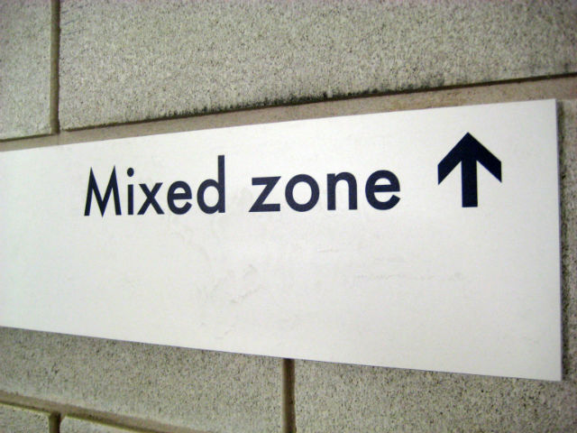 The mixed zone is the designated area in the centre of the track where riders speak to journalists.