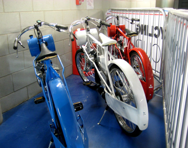 Three dernys – used to pace the riders in training and during the kierin – sit beneath the track ready for use. Decked out in the red, white and blue of Great Britain, the dernys are named Charity, Hope and Faith.