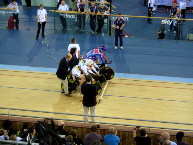Laura Trott, Wendy Houvenaghel and Joanna Roswell prepare to ride their qualifier, with Trott and Houvenaghel wearing the world champion’s skin suits won at the 2011 World Championships with Dani King.