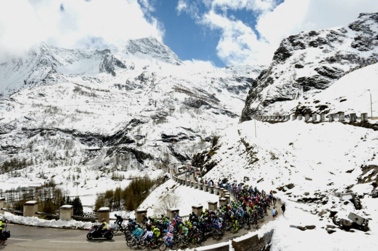 Dramatic images from Stefano Sirotti of riders racing through snow to the summit of Tre Cime di Lavaredo