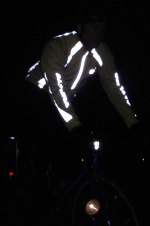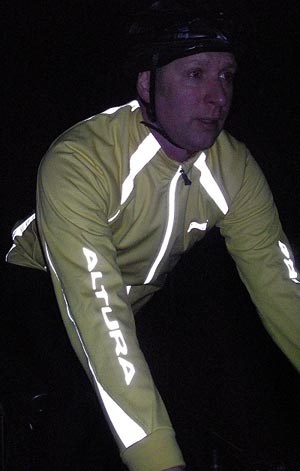 Increasing night time mileage brings me to the subject of making myself visible. Although brightly coloured cycling garments, which are good for day time visibility, have been available since forever, over the years I have worn ‘Sam Brown’ reflective belts and even reflective tabards simply because, at night, a reflective element is still needed to be effective. As you can see from the pictures, the bright yellow colour of this jacket is visible in close up shots only. The secondary shots were taken at a slight distance and, as you can see, only the reflective sections are actually visible. Fortunately, this ‘Night Vision’ jacket is so named because it does contain a generous amount of reflective material.
