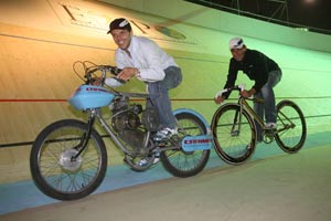 The two Italian two-wheel stars, who are both sponsored by footwear manufacturer Sidi. Bettini rides special rainbow coloured examples of Sidi’s Ergo 2 Carbon cycling shoes while Capirossi races in Vertigo Corsa boots. The moto racer is a fan of pedal-powered sport. ‘I really like cycling,’ Capirossi said; ‘I always take my bike with me when I am away taking part in Grands Prix. I’ve got three bikes. Part of my training routine includes cycling as it is great for general athletic preparation. I saw Paolo riding on the track and was really impressed with how he rides those parabolic corners.’