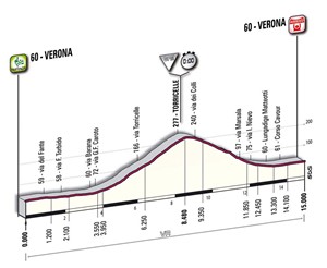 The stage includes the 5km Torricelle climb before finishing in the Roman arena in the centre of Verona.