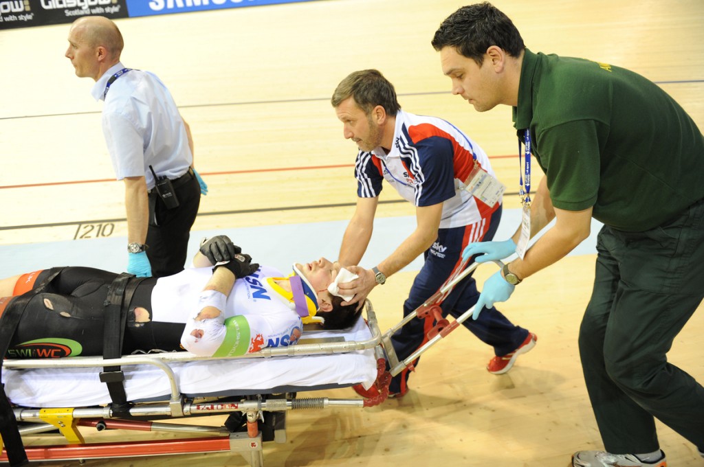 Jason Kenny was left with serious road rash after crashing on the final lap of the men’s keirin final. The triple Olympic gold medallist later withdrew from the individual sprint