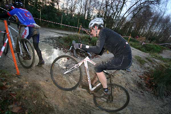 I hung in though. And several laps in started to get a feel for what is my first ever ride on a cyclo-cross bike, and the unique handling characteristics of a narrow and knobbly tyre’d ‘cross bike. Being a keen mountain biker for most of my cycling career had endowed me with enough skills to ably negotiate the trickiest sections, but the relentless pace on the flats and hills, and the brief sections of required dismounting and shouldering of the bike, turned my legs into heavy leaden lumps.