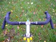 Unlike a lot of ‘custom’ kit on the market, you can’t doubt that these bars really have been custom made. Just a glance will tell you that. First of all, these bars are WIDE. Really, really wide – 58cm centre-to-centre on the drops. Your normal bars are probably 42cm wide. Also, your bars probably have vertical drops, at 90 degrees to the flat central section of the bars. Not these bars, they have really shallow drops that flare outwards at 113 degrees. They also use a mountain bike stem, with a clamp diameter of 25.4mm (rather than 26mm on a road stem). Like I said, weird.