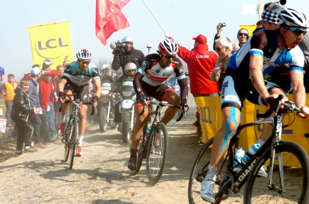 Cancellara then launched a devastating attack on the the cobbles of Bourghelles à Wannehain to drop all but Zdenek Stybar (Omega Pharma-QuickStep) and the duo bridged across to leaders Vanmarcke and Stijn Vandenbergh (Omega Pharma-QuickStep). Both Stybar and Vandenbergh would see their challenge come to an end after each hit a spectator on the Carrefour de l’Arbe sector