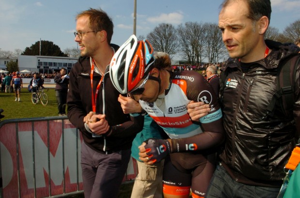 An exhausted Cancellara described the race as a “pure fight to the line” and had to be helped back to the team bus by Radioshack-Leopard staff