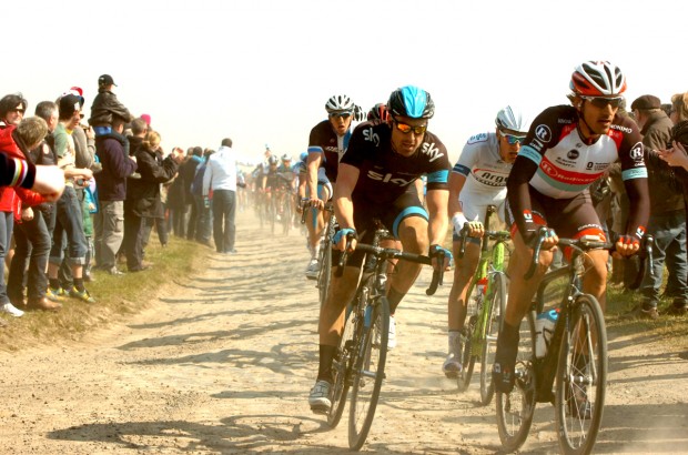 Former champion Stuart O’Grady (Orica-GreenEDGE), Mathew Hayman (Team Sky), Gert Steegmans (not pictured, Omega Pharma-QuickStep) and Clement Koretzky (not pictured, Bretagne Seche) formed a four-man breakaway which held a one minute and 45 second lead at the start of the Trouée d’Arenberg pavé sector