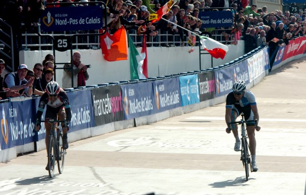 Cancellara and Sepp Vanmarcke (Blanco Pro Cycling) entered the velodrome alone and a nail-biting two-up track sprint saw Spartacus defeat the 24-year-old pretender to claim his third Paris-Roubaix title – and a second Flanders-Roubaix double.