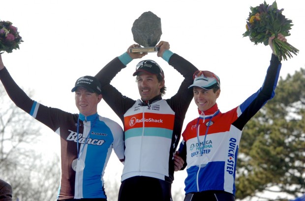 The 2013 Paris-Roubaix podium: Cancellara, Vanmarcke and Dutch national champion Nikki Terpstra (Omega Pharma-QuickStep), who outsprinted Greg Van Avermaet (BMC Racing) and Damien Gaudin (Europcar) for third