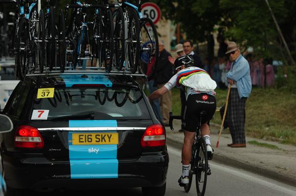Cavendish drops back to one of Team Sky’s Jaguar’s for assistance.