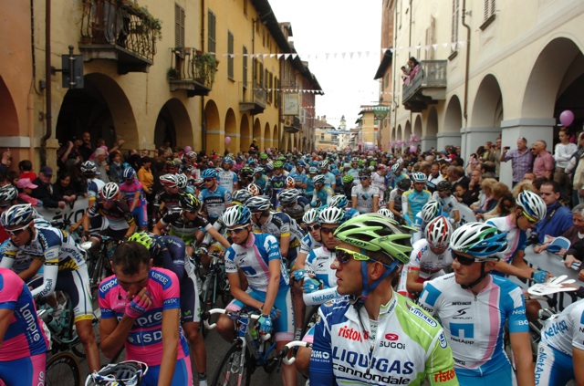 The massed ranks of the peloton filled the streets of Cherasco at the start of the fourteenth stage of the 2012 Giro d’Italia