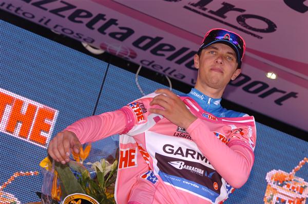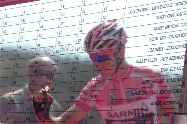 Maglia rosa Ramunas Navardauskas (Garmin-Barracuda) signs on ahead of the 209km stage from Modena and Fano.