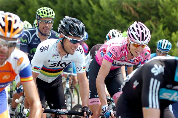 World champion Mark Cavendish (Team Sky) and maglia rosa Ryder Hesjedal (Garmin-Barracuda) share a joke in the peloton.